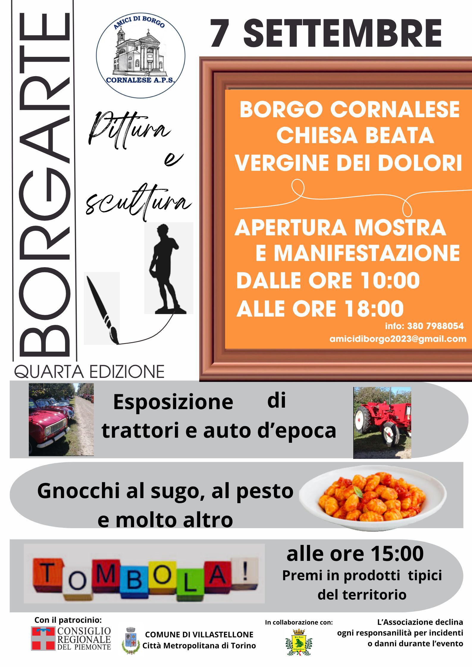 L’autunno è quasi alle porte e Borgo Cornalese si prepara ad accoglierlo con la quarta edizione dell’ormai tradizionale giornata intitolata BorgArte, una manifestazione dedicata a diverse forme di arte coniugate con il piacere di stare insieme in un luogo che racconta in modo suggestivo il trascorrere delle stagioni attraverso i colori della campagna circostante. L’evento, organizzato dall’associazione Amici di Borgo Cornalese in collaborazione con la pro loco di Villastellone e con il patrocinio del Comune e del Consiglio Regionale del Piemonte, si terrà domenica 7 settembre dalle 10 alle 18 nella chiesa della Beata Vergine dei Dolori (ingresso libero) e nell’area adiacente.