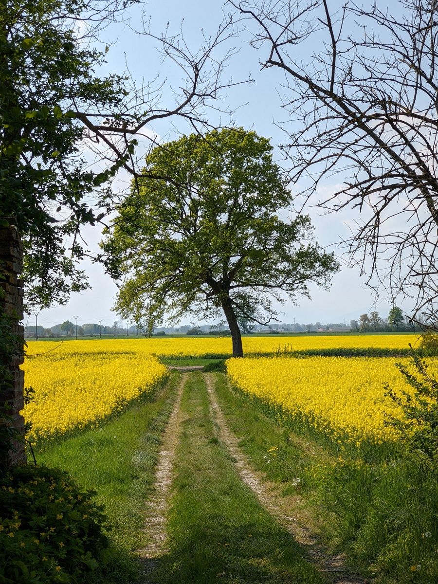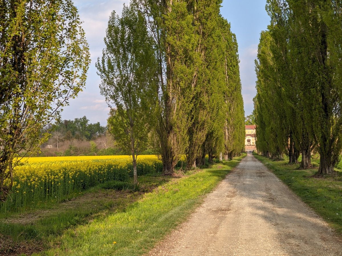 Con la primavera Borgo Cornalese cambia vestito. Il lungo viale di pioppi cipressini che si allunga di fronte al castello fa da spartiacque tra due ali di campi che da aprile si colorano di giallo brillante per la fioritura della colza.