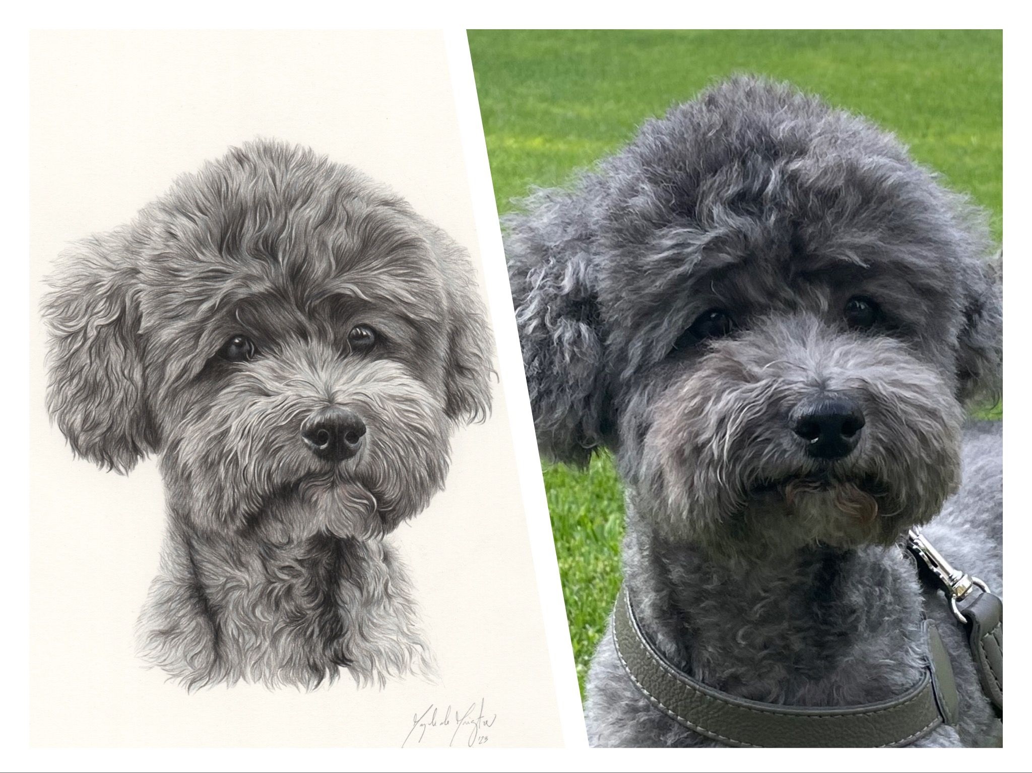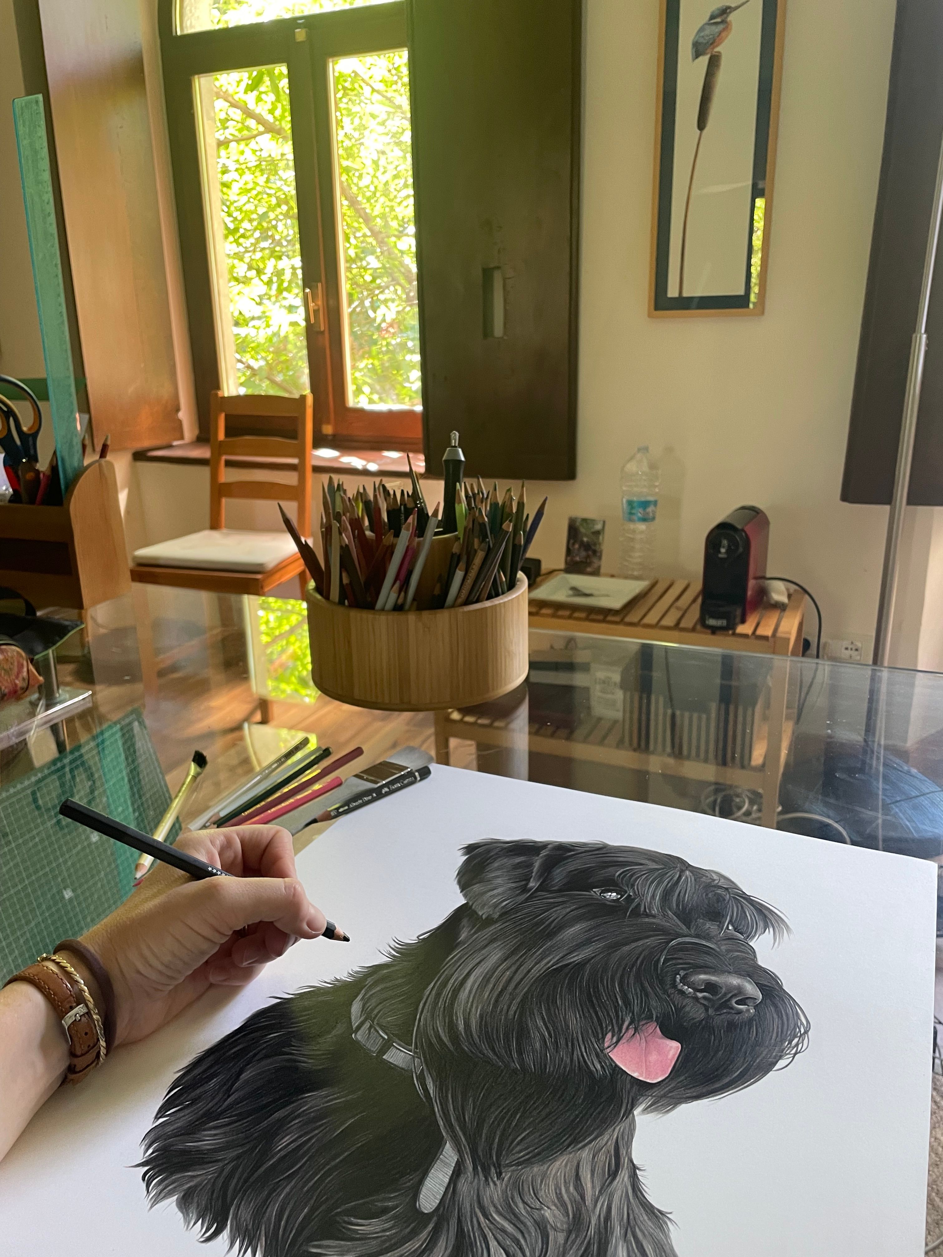“Oltre agli animali ultimamente disegno anche case perché mio papà non lo fa più (Xavier de Maistre, noto incisore di dimore storiche – ndr) e realizzo ritratti di persone, ma disegnare animali e la parte naturalistica mi piace molto di più – commenta l’artista 36enne parlando con trasporto della propria attività – Certo, disegnare pelo per pelo richiede tempo, ma mi sono velocizzata specializzandomi con la tecnica e nella mostra si vede anche la mia crescita”. In ogni ritratto si nota l’attenzione ai particolari, tanto che il soggetto pare essere vivo e uscire dal foglio. Il lavoro parte sempre dalle foto: prima l’organizzazione per incontrare il committente e il suo animale, quando possibile, poi gli scatti a questi e la scelta di quello da cui nascerà il disegno. “Spesso mando il work in progress perché so che piace e inizia a rendere l’idea di ciò che sarà; infine consegno l’opera in una cartellina creata da me. Molto spesso è successo che il committente si commuovesse di fronte al disegno del proprio animale che non c’è più - racconta Magali – Per le case, invece, si può scegliere tra la tecnica in bianco e nero e i colori e di solito aggiungo un elemento davanti all’edificio, qualcosa di caratterizzante. Disegno anche montagne, ma i ritratti sono più complessi perché è più facile sbagliare non cogliendo un microdettaglio”.